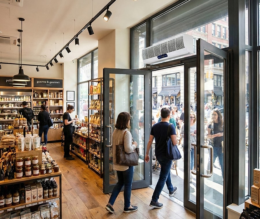 Em estabelecimentos comerciais, como shoppings, lojas e restaurantes, a cortina de ar proporciona um ambiente mais agradável, silencioso e confortável para os clientes, impactando diretamente na percepção de qualidade do espaço.